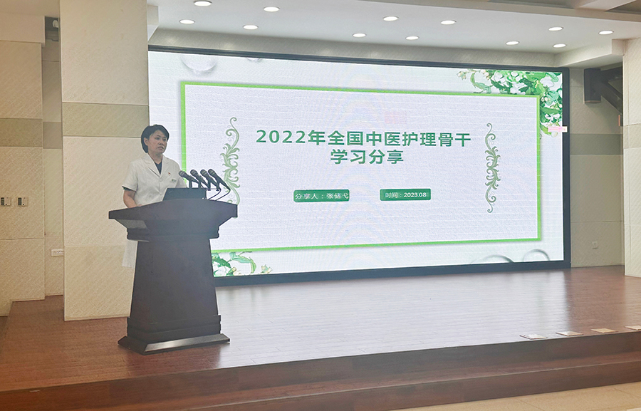 培训中,医院总部心病科护士长张储弋讲述了在全国护理骨干培训的学习收获和心得。她重点围绕先进的中医护理文化和理念进行了分享,包括中医基础理论、中医护理团队建设、中医护理优势技术、中医名护培养及中医护理特色门诊的建立等。