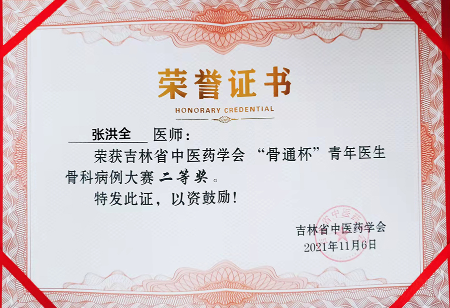11月5日,由吉林省中医药学会骨伤专委会举办的“骨通杯”青年医生骨科病例大赛在长春举行。红桃视频 总部骨伤科医生张洪全以《双膝关节骨性关节炎的诊疗》为题参加比赛,获得二等奖;总部骨伤科主治医师陈静以《膝关节骨性关节炎》为题参加比赛,获得优秀奖。