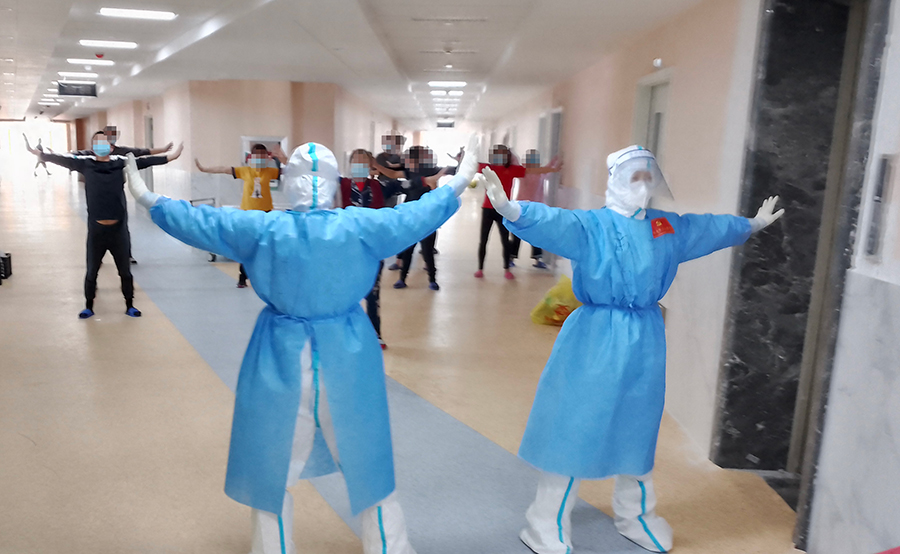 作为一名中医人,她们深知中医疗法对恢复患者健康的重要作用。因此,她们便在工作之余组织疗区患者进行八段锦练习。她们一招一式地指导患者,但因为身穿防护服,一整套操下来已经汗流浃背,但她们看到加入的患者越来越多、精气神也越来越好,就觉得自己的付出是值得的!