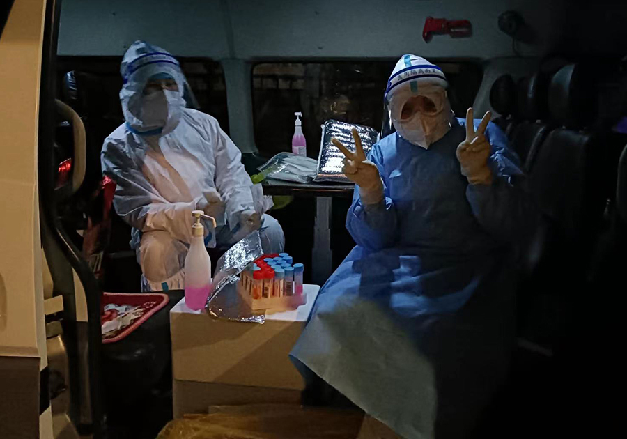 三月的长春,乍暖还寒。尽管吴丹和队友们都准备了保暖贴,但是长时间户外工作,仍被“透心凉”。虽然条件艰苦,但他们从未有过抱怨,都积极配合街道、社区完成域内的核酸采集任务。在条件简陋的流动车内,吴丹和队友无法站直身体,但大家依然坚持完成每一个人的采样工作。采样工作结束后,大家脱下防护服时,衣服已经完全湿透。而由于室外温度低,每天还要经过上千次的采样洗手,有些队员的手已形成了冻疮。