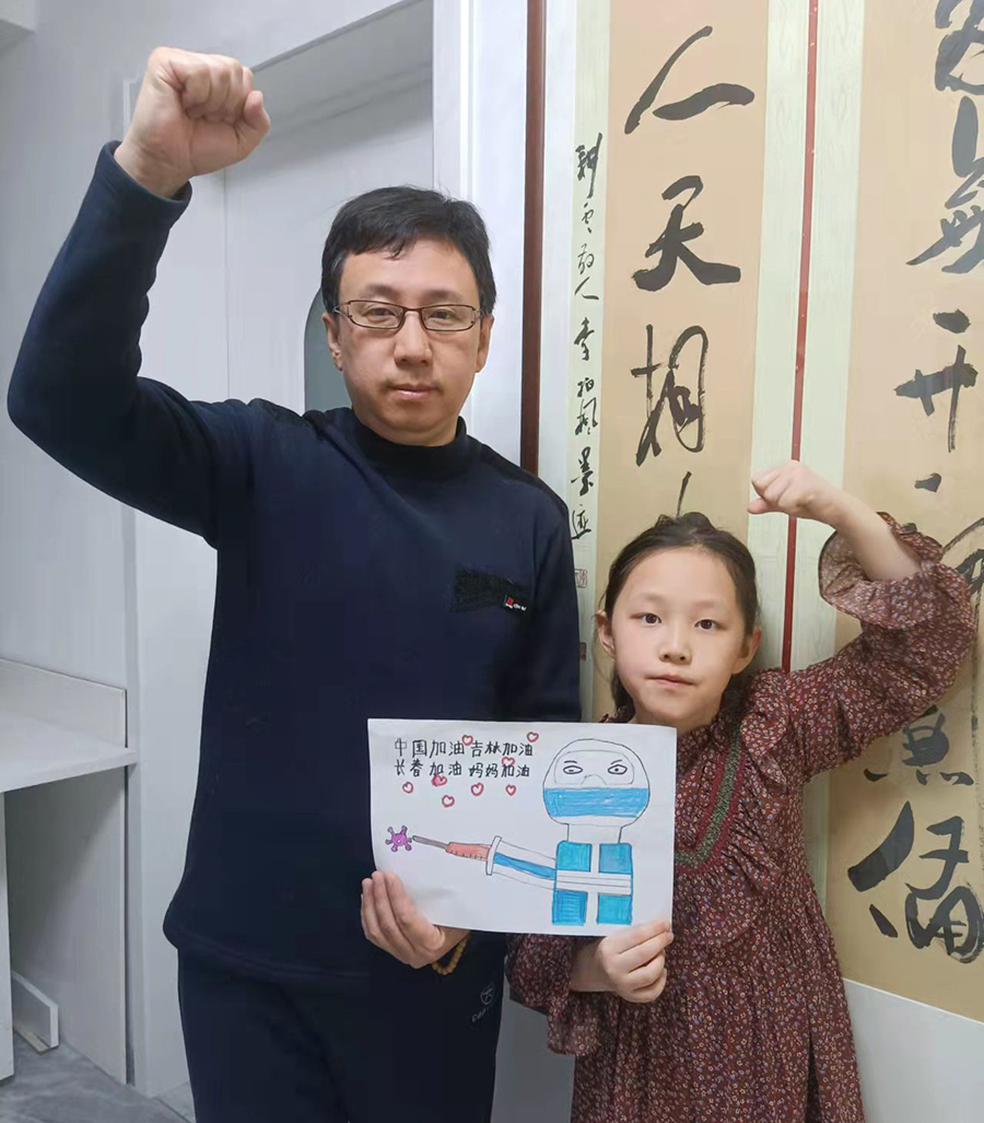 吴丹和队员们奋战在一线离不开家人的理解和支持。有的孩子为妈妈送来加油呼喊;有的家人制作了小视频,送来鼓励的话语;有的女儿特地为妈妈画了一幅画,上面是医护人员在消灭病毒。女儿还在上面写了两行字“中国加油!吉林加油!长春加油!妈妈加油!”抗击疫情的军功章必须有你们一半!