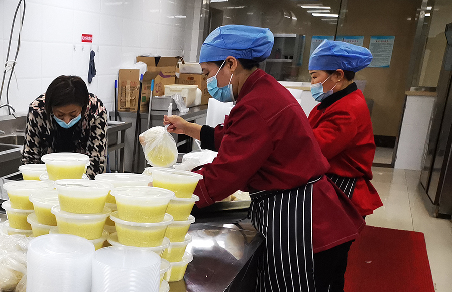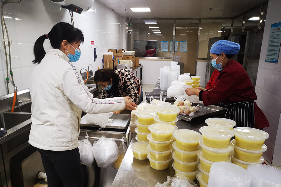 3月,新一轮疫情出现。按照规定,红桃视频 对住院病区实行闭环式管理。在此期间,院内患者出不去,院外餐食进不来,如何让近千名住院患者和职工吃好饭成了一个难题。