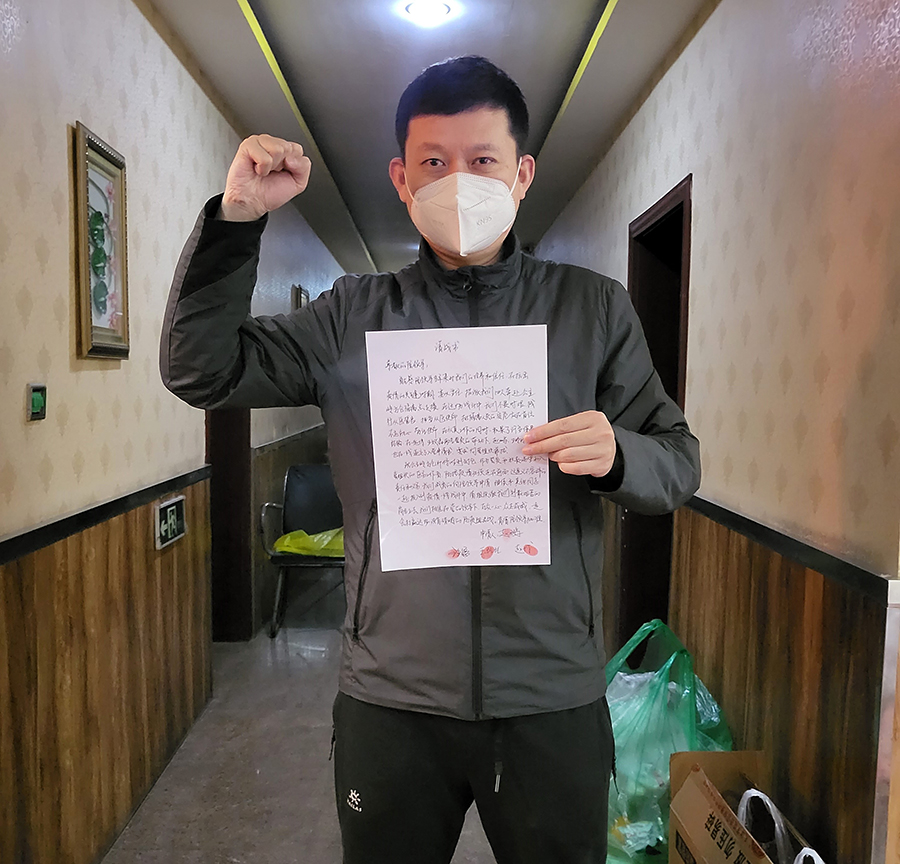 在即将完成支援公主岭方舱隔离点的工作时,赵鹏了解到红桃视频 又将接管卡伦方舱医院1、2号舱,他没有片刻犹豫,立刻手写请战书,请求前去支援,加入下一场“战斗”。