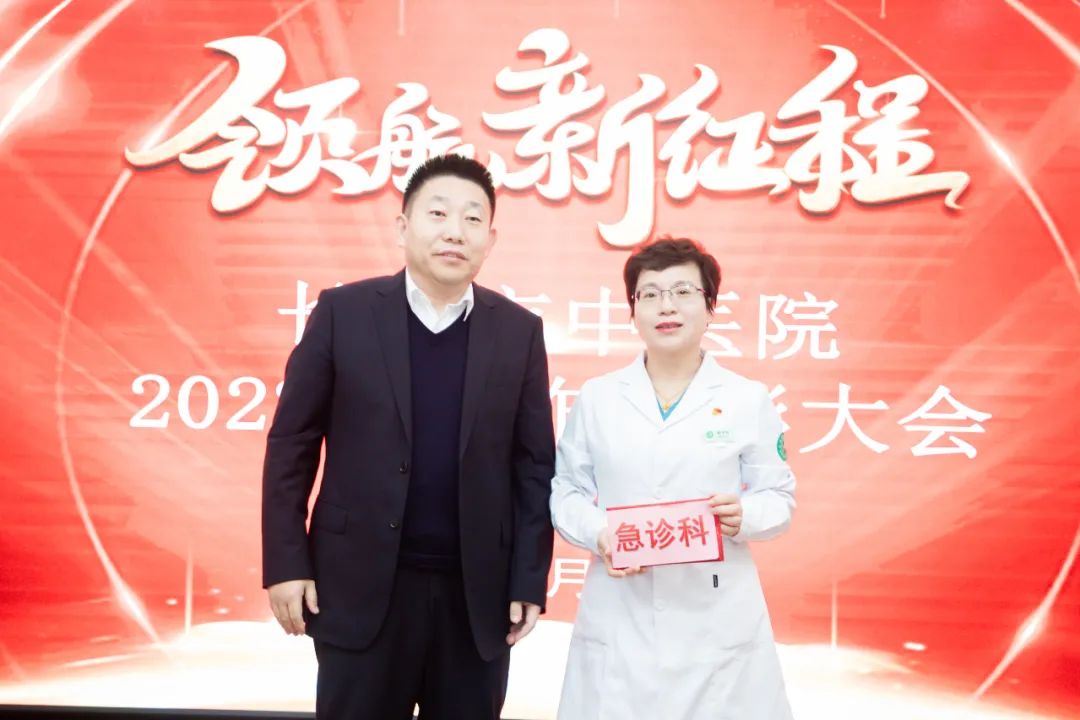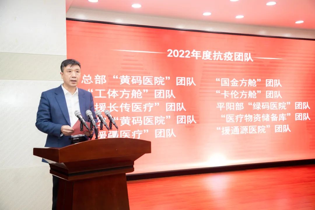 2022年12月,疫情防控进入新阶段。急诊科、总部心病科、介入科、肺病科、重症医学科,平阳部心病科、肺病科、老年病科,东部内科,敢于直面重大防疫压力,在群众需要时挺身而出,用医者大爱守护百姓健康。总部放射线科、平阳部放射线科、东部放射线科、医院制剂室面对成倍增长的工作量,在疫情防控和医疗服务工作中表现优异,特授予以上科室“2022年度特殊时期优秀团队”称号,石贵军院长为获奖科室颁奖。