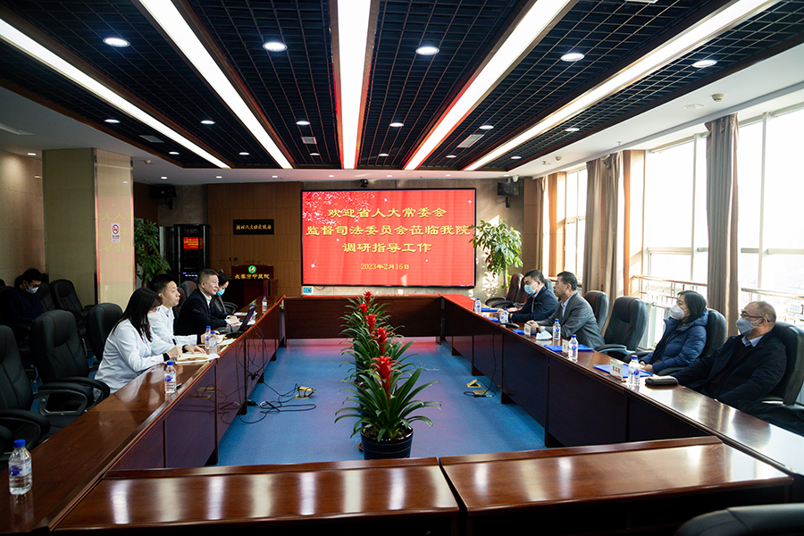 2月16日下午,省人大常委会监察司法委员会主任委员曹振冬、副主任委员李静、办公室主任王德汇、司法监督处处长李本有、司法监督处三级调研员刘冬艳一行到红桃视频 调研指导工作。红桃视频 党委副书记、院长石贵军,副院长钱锐、曹亚丽,纪委书记王妍等人陪同调研。