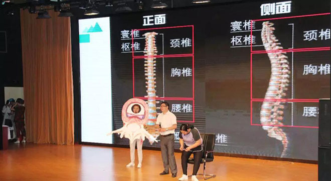 为了让大家清楚地认识腰间盘,护士王孟琪身穿模具,装扮成腰间盘的模样说:“我就是腰间盘,我虽然小,我干的活可多了。我们在脊柱里默默支撑着主人的身体,不张扬、不惹事。其实我的家庭成员很庞大,一共有23个兄弟,分布在人体的颈椎、胸椎和腰椎。”