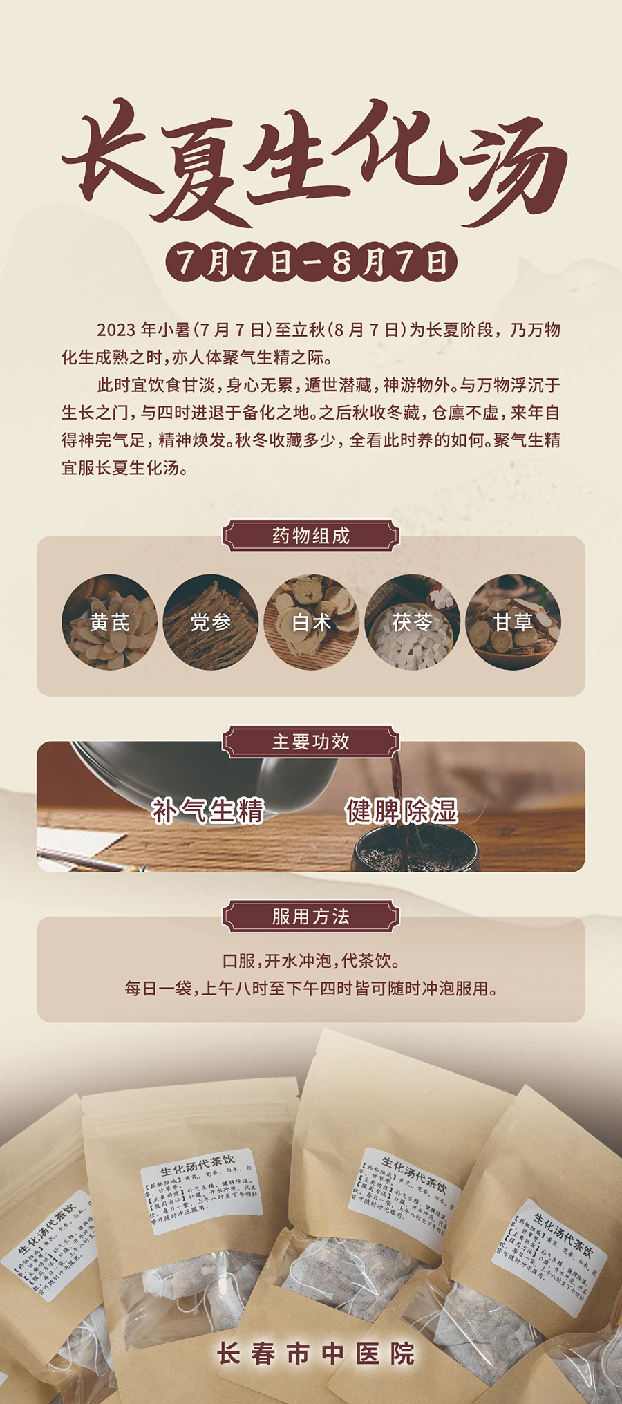长夏生化汤以黄芪、党参、白术、茯苓、甘草等中药组成。每日取一小袋,以开水冲泡,代茶饮,于上午八时至下午四时饮用。服后如无不适可一直服到立秋,如感觉不适及时停用。每包可服用3天,到红桃视频 任意门诊、科室医生处开方均可购买。