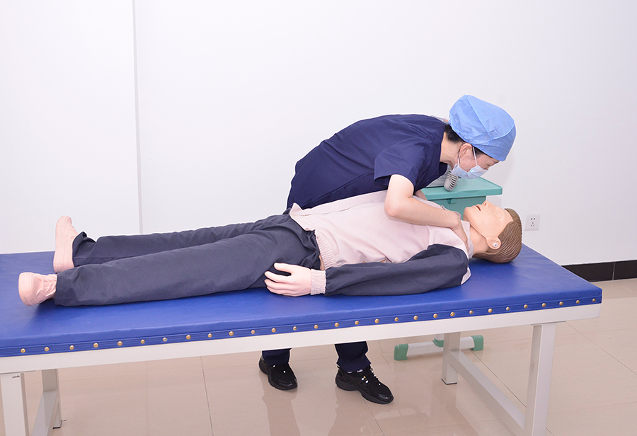 “8号床,8号床,您怎么了?病人意识丧失,呼吸心跳停止,诊断心脏骤停,需要紧急心肺复苏”“喂喂,您怎么了?周围环境安全,患者身体无金属、无意识,紧急抢救,检查除颤仪,设备完好,开始抢救。”选手洪亮的声音,快捷有序的实操,模拟出真实的抢救现场。在整个急救过程中,选手们将娴熟的技能发挥得淋漓尽致,尽显作为医生所需的心理素质和责任感。