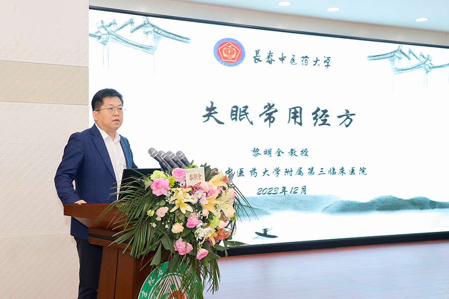 ▲吉林省名中医、长春中医药大学附属第三临床医院副院长黎明全结合多年临床经验,以《失眠常用经方》为题,为与会学员就胡希恕经方思维辨证诊疗的理念,进行了深入浅出的讲授。