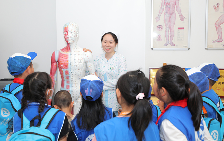 最令大家期待的,就是总部13楼实训中心了。小记者们分为3组,在护理实训室,他们学习了人体经络和护理急救技能;在中药浸渍标本室,他们学会了辨识各类中药材和草药标本;在针推实训室,他们揭开了中医特色疗法的神秘面纱。