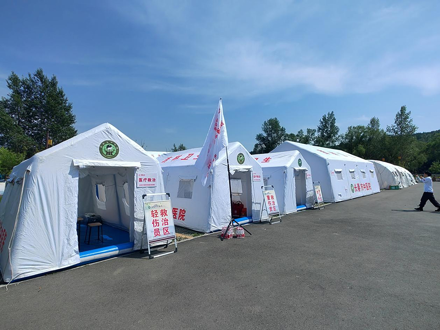 演练现场,我院救援队抵达“灾区”后,立即投入营地搭建工作。指挥帐篷、分诊帐篷、救治帐篷、物资帐篷等迅速搭建完毕,形成了一套完整的医疗救治体系。营地布局合理,医疗与生活物资充足,能完成常见轻伤、危重伤的救治和转运工作,为接下来的救援工作奠定了坚实基础。