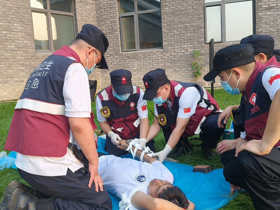 27日下午,搜救演练正式开始。我院由骨科、外科、心病科及急诊科等多学科医生组成的搜救小组,携带担架、急救背囊、外伤急救箱、抗休克裤等救援装备深入“灾区”腹地,成功搜救一名伤者。经专业检查,队员们发现伤者颈部外伤出血合并骨盆骨折、左上肢骨折。救援队员立即进行了颈部伤处包扎、小夹板固定、骨盆骨折固定等急救措施,用担架将患者转运至营区危重伤救治帐篷,并与营区医护人员完成交接。队员们迅速而准确的急救措施赢得了现场评委的高度评价,最终与其他三支省级医学救援队共同位列考核第一档。次日,吉林省卫健委安排10支医学救援队伍前往马鞍山红色教育基地进行参观学习,还组织了“群体群伤分类救治的专项培训”,特邀国家紧急医学救援队(吉林队)的资深专家进行精彩点评,为各救援队提供了宝贵的实战经验分享。