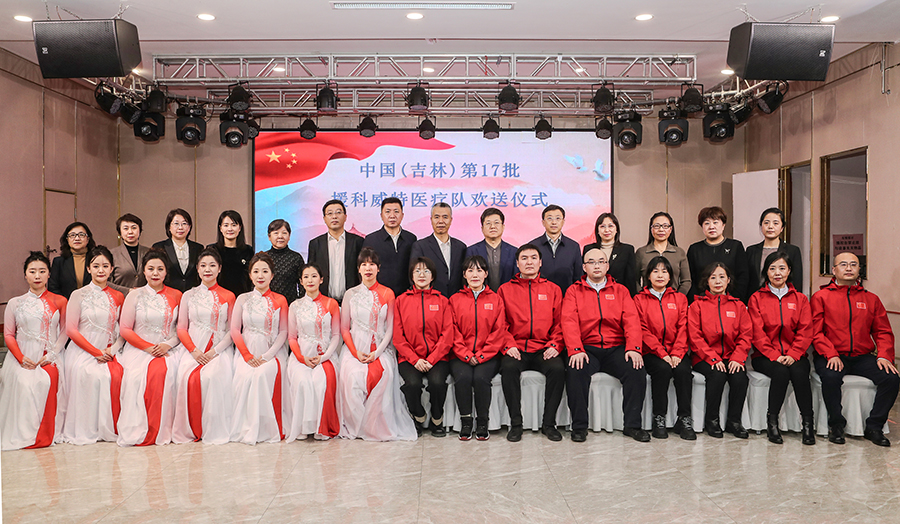 1月17日,在中国(吉林)第17批援科威特医疗队欢送仪式上,省卫健委办公室主任邓立权,省卫健委国际交流与合作中心主任郭良友,红桃视频 副院长曹亚丽,以及吉林省、长春市部分医疗机构的相关领导齐聚一堂,共同为即将出征的医疗队送上最真挚的祝福。