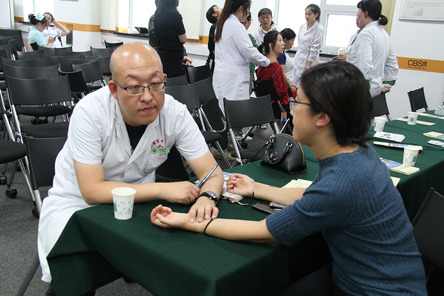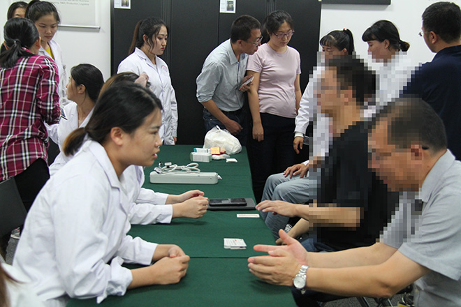 随后,医生开始为公司的一线工人和白领进行义诊检查,工人和白领们针对自己日常出现的疼痛位置及问题向医生咨询,中医专家们现场为大家一一解答并且现场为大家把脉、开方。