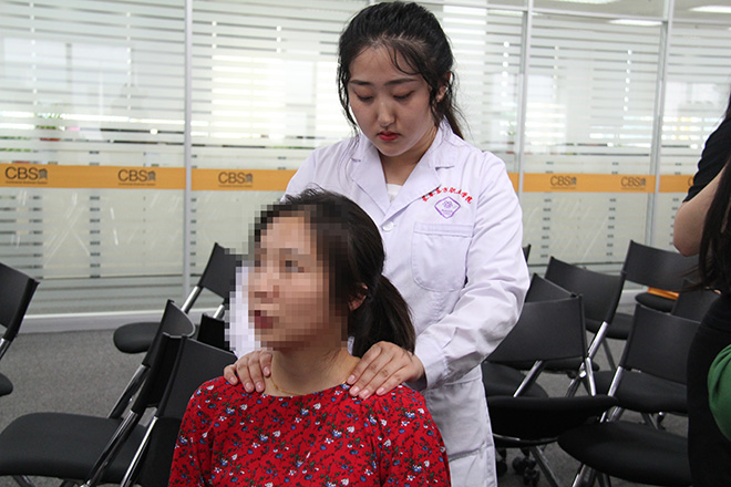 义诊中,有位女士由于长时间坐在电脑前导致自己的颈椎受到严重的损伤,平时还伴有偏头痛,脖子疼等状况,王玲玲医生决定对她施针治疗,并且对她进行了颈椎复位治疗,王玲玲医生表示,这次针灸只会起到缓解作用,一次不能根治颈椎病,要坚持治疗几个疗程,并且要注意自己的坐姿和坚持锻炼身体,这样颈部才会减少损伤。