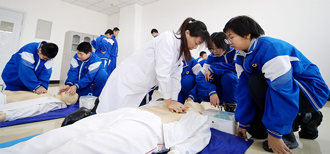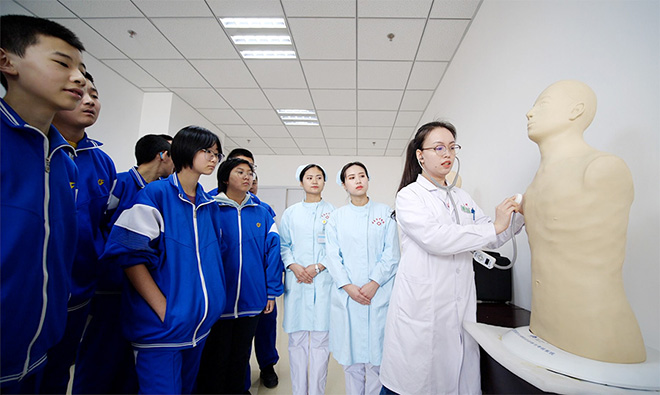 随后学生们参观了模拟诊室、模拟病房、模拟处置室、心肺听触诊实训室、急诊急救实训室、中医护理技能实训室等,通过进行模拟实验,让学生们初步了解中医文化,体验中医魅力。