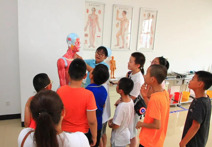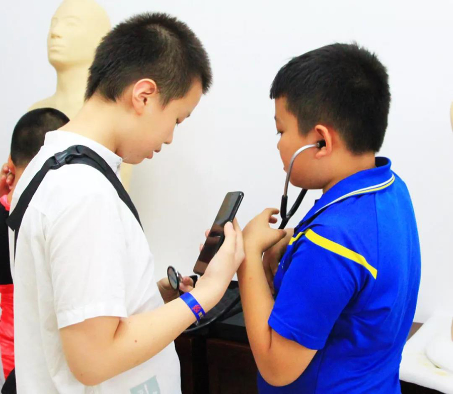 在13楼实训中心的中药实训室里,通过观、触、嗅、尝全方位感受中草药神奇的魅力,了解药食同源的理论,了解中药在人们生活中所起的作用。在心肺听诊实训室,讲解员教授每位同学使用听诊器听心音和肺音,教大家摸脉搏、数脉搏,让大家了解人体脉搏的正常值。