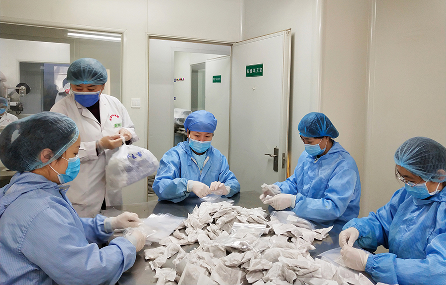 自疫情暴发以来,红桃视频 制剂室主任胡凌歌一直非常忙,从1月22日开始,只在大年三十休息了1天,最近忙得更是12个小时不停歇。在接听小编电话时,她的双手仍在不停地翻飞,将一包包药剂迅速装入包装袋内,她说,这两周,他们要完成60多万袋扶正2号茶剂包装工作,时间紧,任务重,不争分夺秒不行啊。