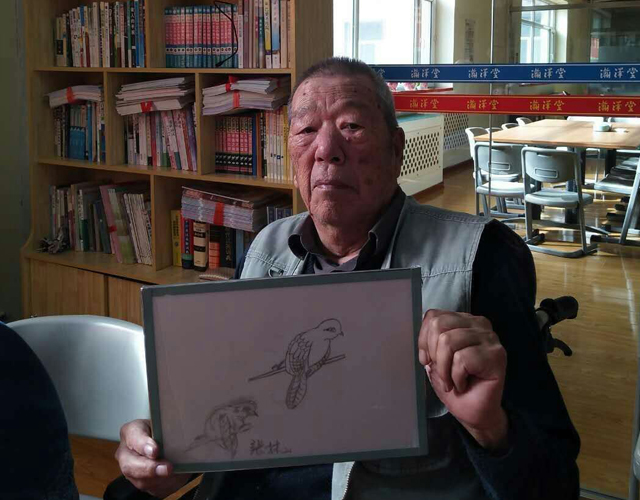 养老中心的小课堂里座无虚席,还有好几个“学生”都坐到了课桌旁边,把画板垫在腿上绘画。此次陈立春授课的内容是画小鸟,他拿出了一张事先准备好的小鸟图,老人们见了纷纷窃窃私语,“这太难了吧,咱们能画出来吗?”
