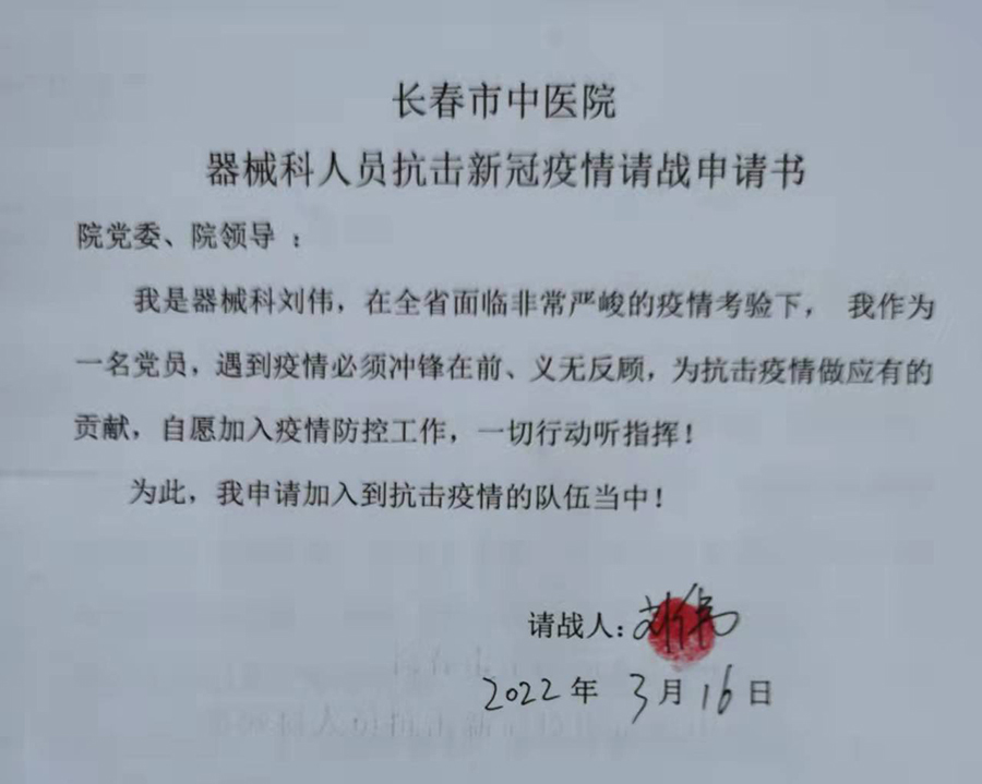 “作为共产党员,遇到疫情必须冲锋在前,义无反顾,要时刻体现共产党员的先进性,为抗击疫情做出我们应有的贡献!”器械科科长张雷在“请战书”中这样写道。该科还有刘伟、邹玉迎、宋扬、霍英龙、郭阳、林爱群和李泽林等党员和职工也都递交了“请战书”。