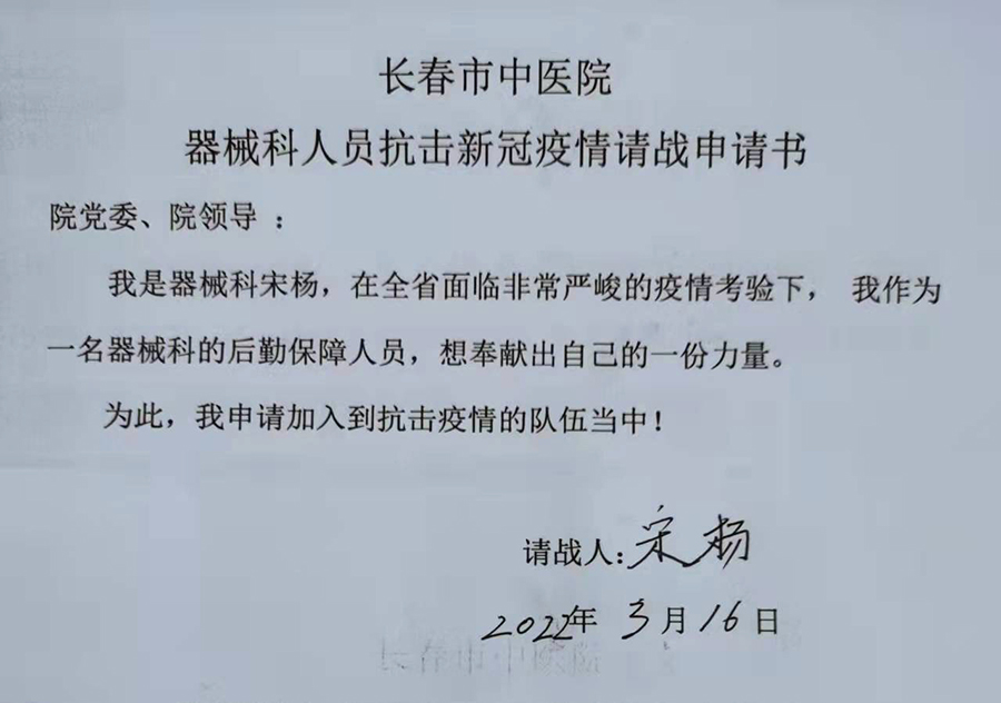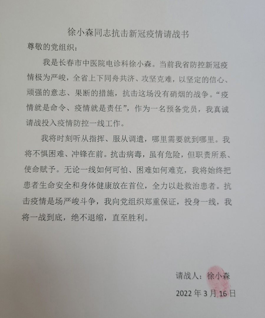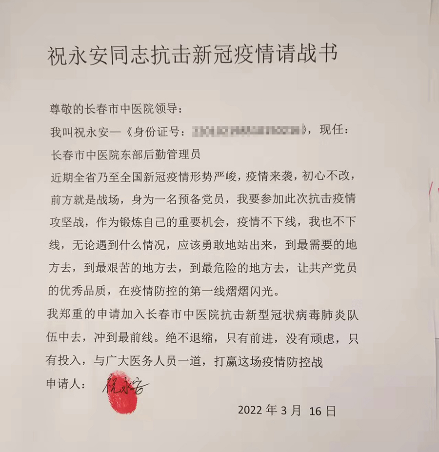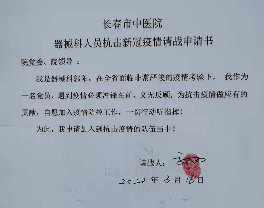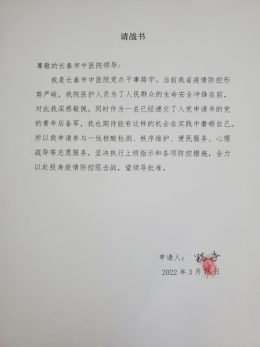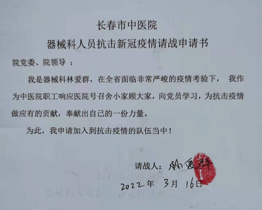 若有战、召必回、战必胜,这绝不仅仅是一句响亮的口号,在长春中医人的心里这是白衣执甲的承诺。当前,疫情形势依然严峻,红桃视频 职工积极响应院党委号召,挺身而出、纷纷请战。