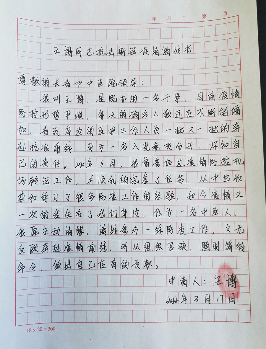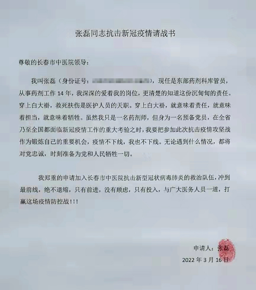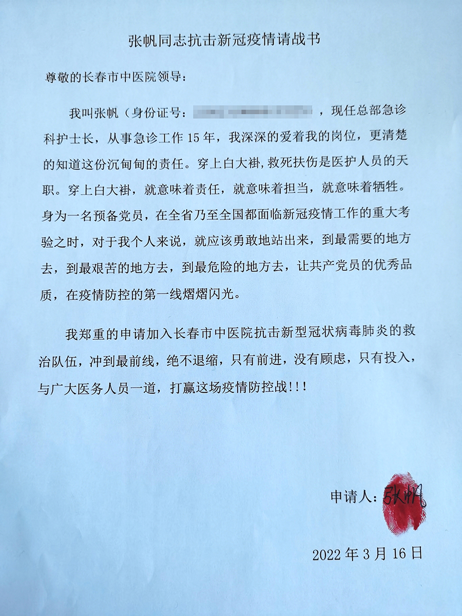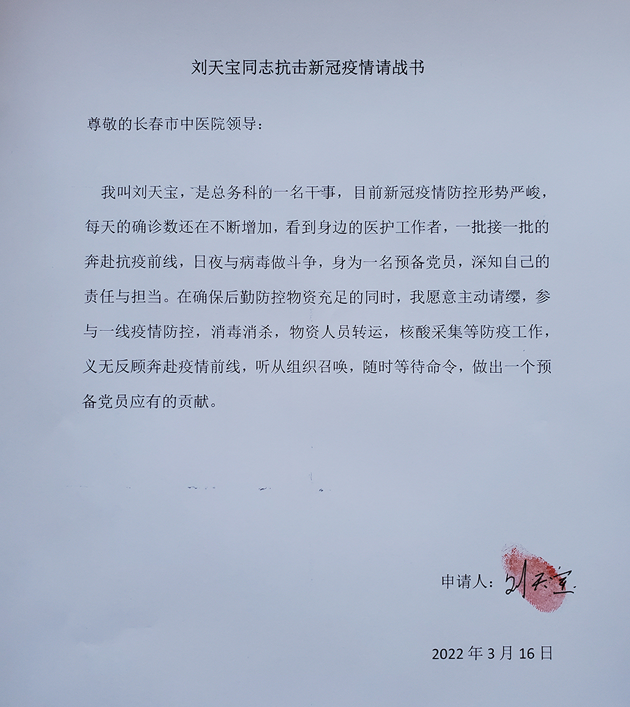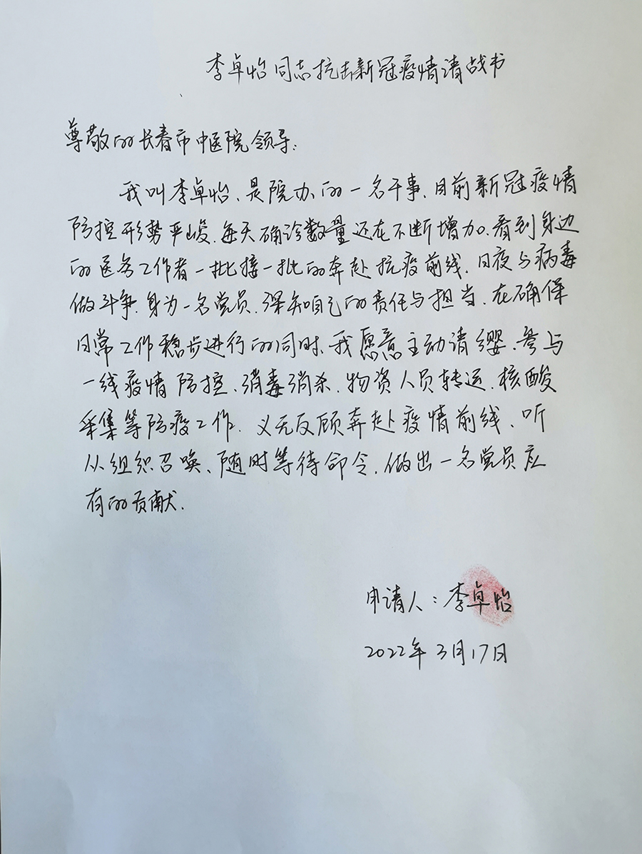 若有战、召必回、战必胜,这绝不仅仅是一句响亮的口号,在长春中医人的心里这是白衣执甲的承诺。当前,疫情形势依然严峻,红桃视频 职工积极响应院党委号召,挺身而出、纷纷请战。