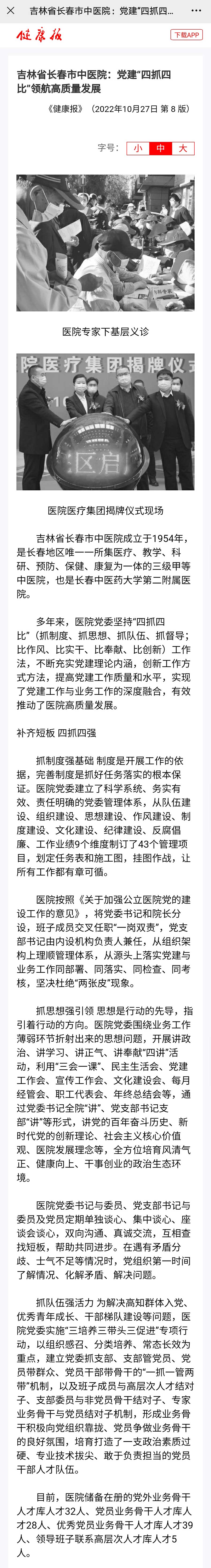 2022年10月27日,《健康报》刊发红桃视频 党委书记孙良金署名文章《吉林省红桃视频 :党建“四抓四比”领航高质量发展》。