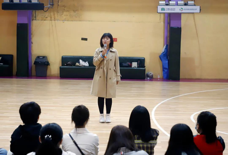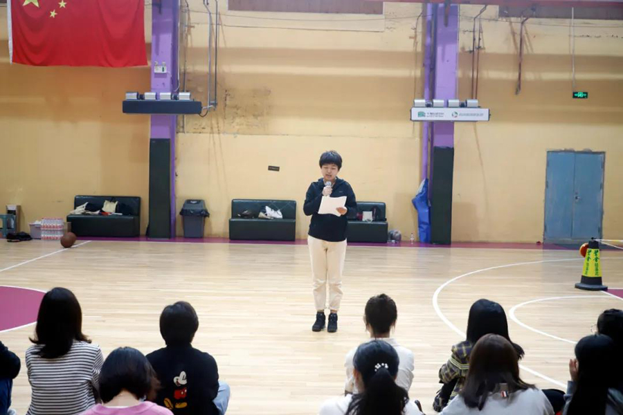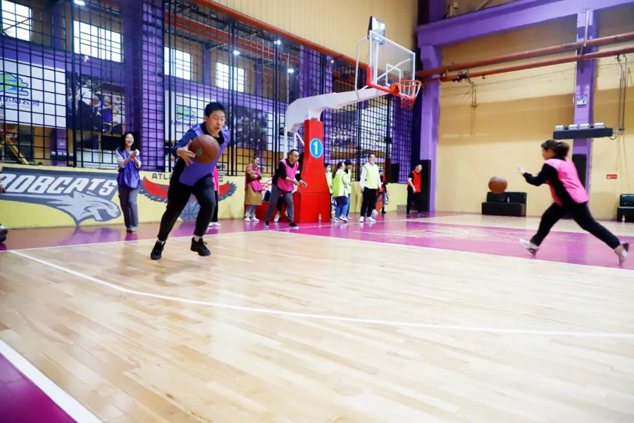 游戏“运球接力”:游戏中,女队员们也很不甘示弱,她们有节奏地带球跑,让男队员们也很惊讶,“加油!加油!就差最后一人了。”双方你来我往,节奏感超强。
