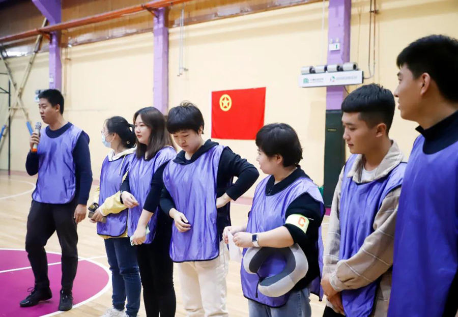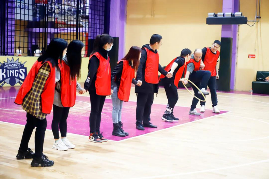 游戏“团结向前”:每队队员手牵手站成一排,传递呼啦圈,过程中手不可以松开,速度最快的队员得分最高,该游戏充分展示了个人的身体协调性和团队协作能力。“快,快,快...咱们队马上就第一名了,这可是拉开积分的好时机啊”。
