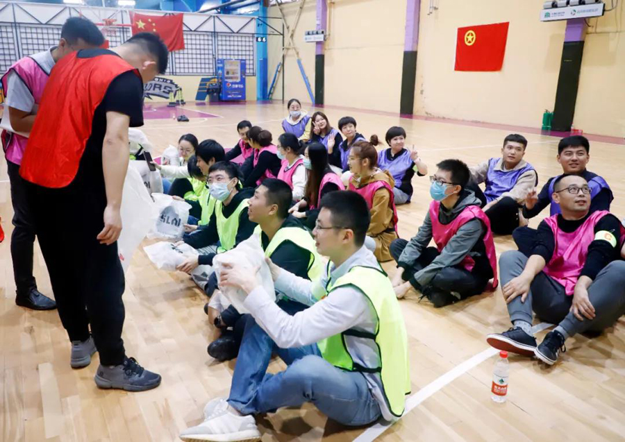 两个单位共计40名团员按照抽签结果进行分组,共分成绿、红、紫、粉4支队伍。