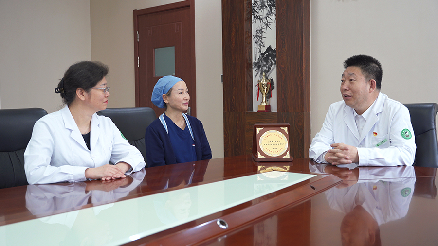 周艳副书记握着周洁的手说:“医院无论何时都是退休职工的坚强后盾,‘家’的大门永远为大家敞开,希望能常回‘家’看看。”