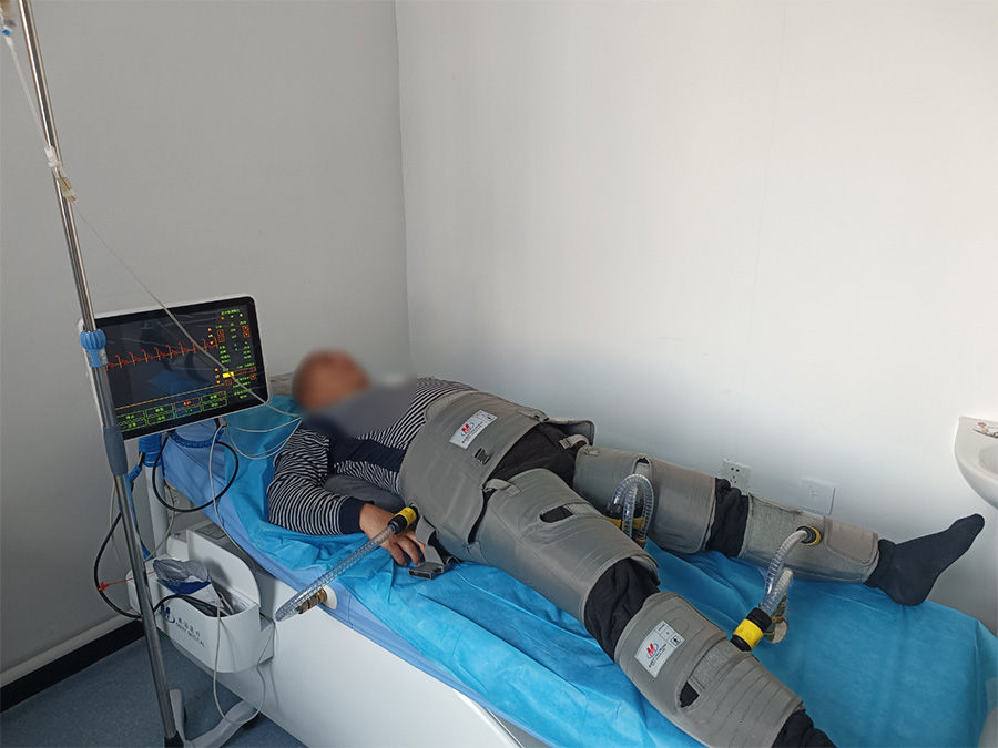 患者平卧于反搏床上,下肢及臀部裹以特制的气囊套,在心电监护下,收缩绑在小腿、大腿及腹部的压脉带,对下肢及臀部进行由远及近的序惯加压,使下半身的血液返流至上半身,从而改善心、脑等重要脏器血流灌注,同时可使双下肢静脉回心血流增加,从而提高心输出量。