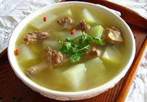 【原料】冬瓜500克,鸭肉500克,猪瘦肉100克,芡实、薏苡仁各50克,荷叶1片,陈皮5克,精盐、味精各适量。