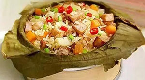 【做法】鸡肉、蘑菇均切成薄片,火腿切成10片,葱切短节、姜切薄片,荷叶洗净,用开水稍烫一下,去掉蒂梗,切成10块三角形备用。蘑菇用开水焯透捞出,用凉水冲凉,把鸡肉、蘑菇一起放入盘内加盐、味精、白糖、胡椒粉、绍酒、香油、鸡油、玉米粉、葱节、姜片搅拌均匀,然后分放在10片三角形的荷叶上,再各加一片火腿,包成长方形包,码放在盘内,上笼蒸约2小时,若放在高压锅内只须15分钟即可。出笼后可将原盘翻于另一干净盘内,拆包即可食用。