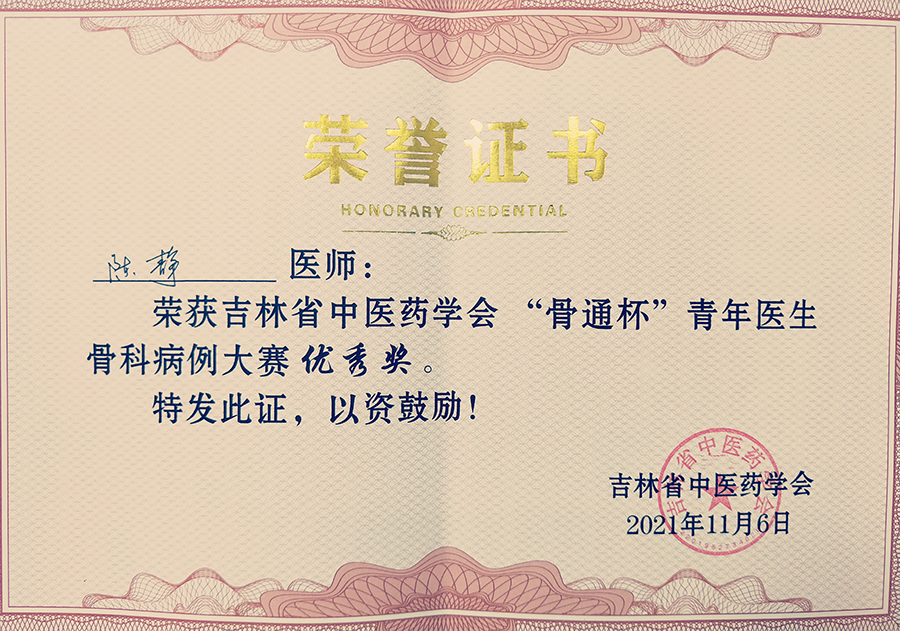 11月5日,由吉林省中医药学会骨伤专委会举办的“骨通杯”青年医生骨科病例大赛在长春举行。红桃视频 总部骨伤科医生张洪全以《双膝关节骨性关节炎的诊疗》为题参加比赛,获得二等奖;总部骨伤科主治医师陈静以《膝关节骨性关节炎》为题参加比赛,获得优秀奖。
