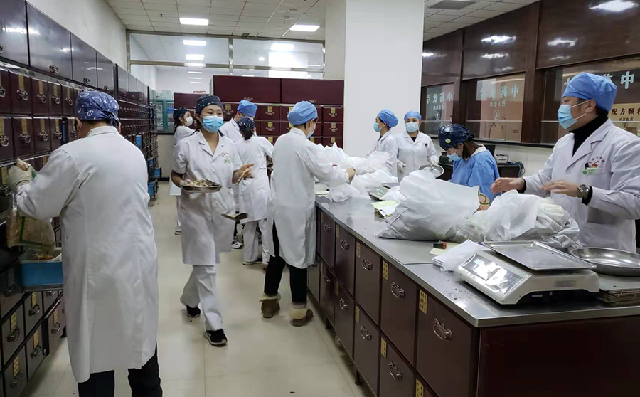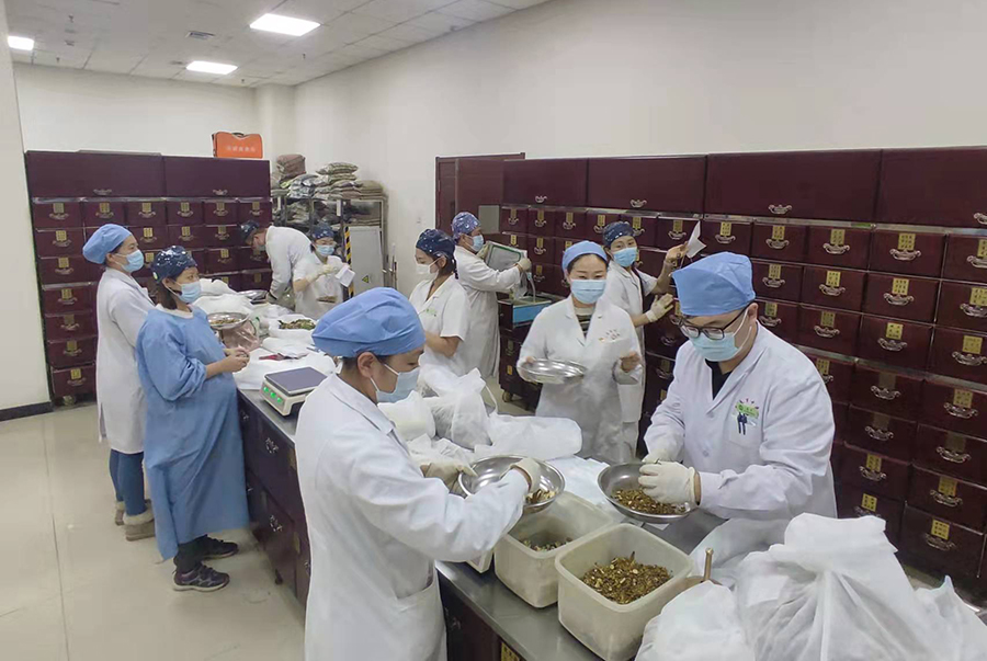 面对人手不足的局面,药剂科各岗位的人员都伸以援手,所有具备资质的人员都主动前去帮忙。人员最多时,原本只有7人的中药饮片药房达到了13人。他们分工明确,称药、配药、核对、投药有序进行,极大缓解了人员缺乏的困难。他们早上7点30分到岗,中午轮流吃饭,放弃午休,干到下午5点左右才结束。每天几千付草药经他们的手调配给患者。就这样,他们加班加点工作已持续了一个多月,用辛勤的汗水,保障患者的用药安全和医疗工作的顺利开展。