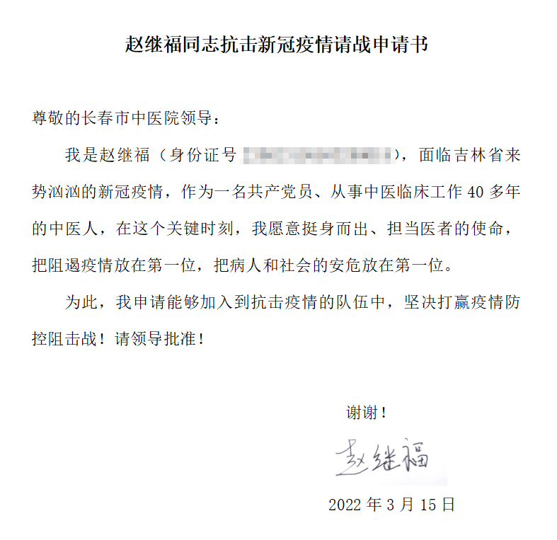 当前,吉林省疫情形势依然严峻复杂,正处于最吃劲的关键阶段。作为抗疫的主力军,全省各地的医务工作者们纷纷提申请,递志愿,都要到抗疫一线去!就连67岁的老党员、全国名中医、红桃视频 赵继福教授也写了“请战书”。 他在“请战申请书”中写道:“面临吉林省来势汹汹的新冠疫情,作为一名共产党员、从事中医临床工作40多年的中医人,在这个关键时刻,我愿意挺身而出、担当医者的使命,把阻遏疫情放在第一位,把病人和社会的安危放在第一位。为此,我申请能够加入到抗击疫情的队伍中,坚决打赢疫情防控阻击战!”