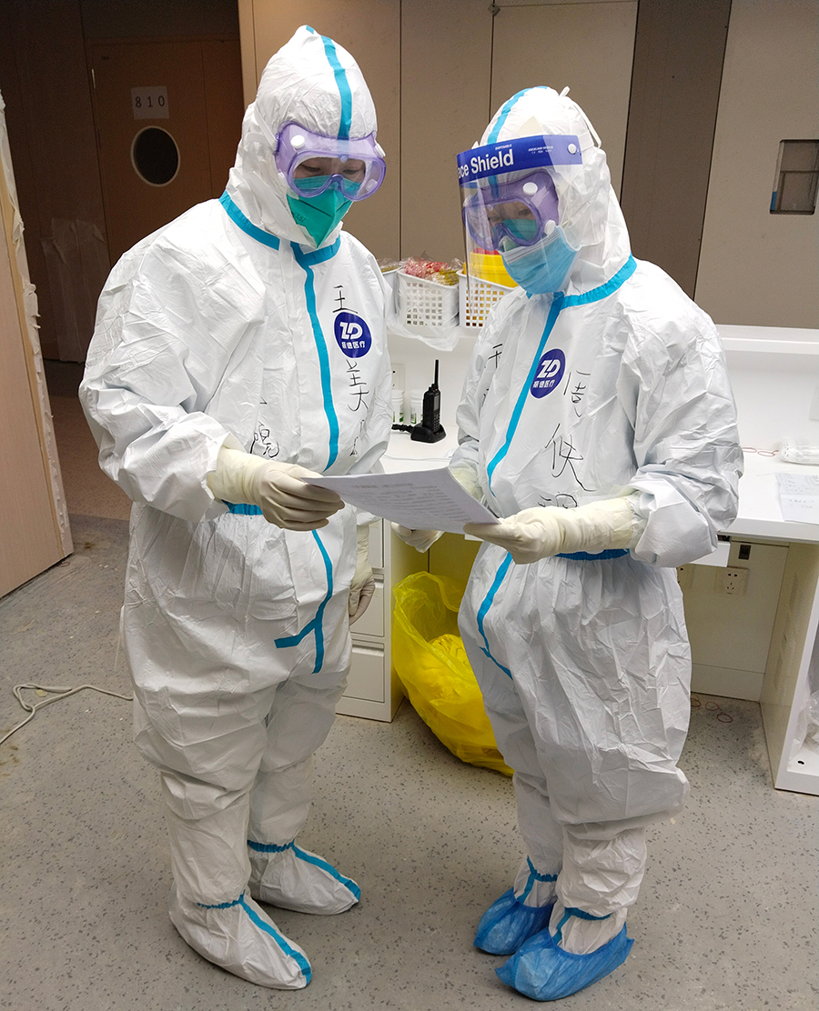 3月28日,王美晶再次接到医院指令,她与同事们共赴吉林国金方舱医院,参与方舱医院的前期筹备工作。为保障当晚能够顺利收治患者入舱,她们紧急对护士开展舱内工作培训。在东部肺病科护士长张丽霞的指导下,王美晶在短时间内完成了护士排班及工作流程的梳理。当晚,吉林国金方舱医院顺利收治患者入舱。随即,大家又完成患者群的组建。作为患者群内的工作人员,王美晶时刻都需要关注患者的情绪变化,想尽一切办法满足患者的需求……在前3天的工作中,她仅休息了6小时。
