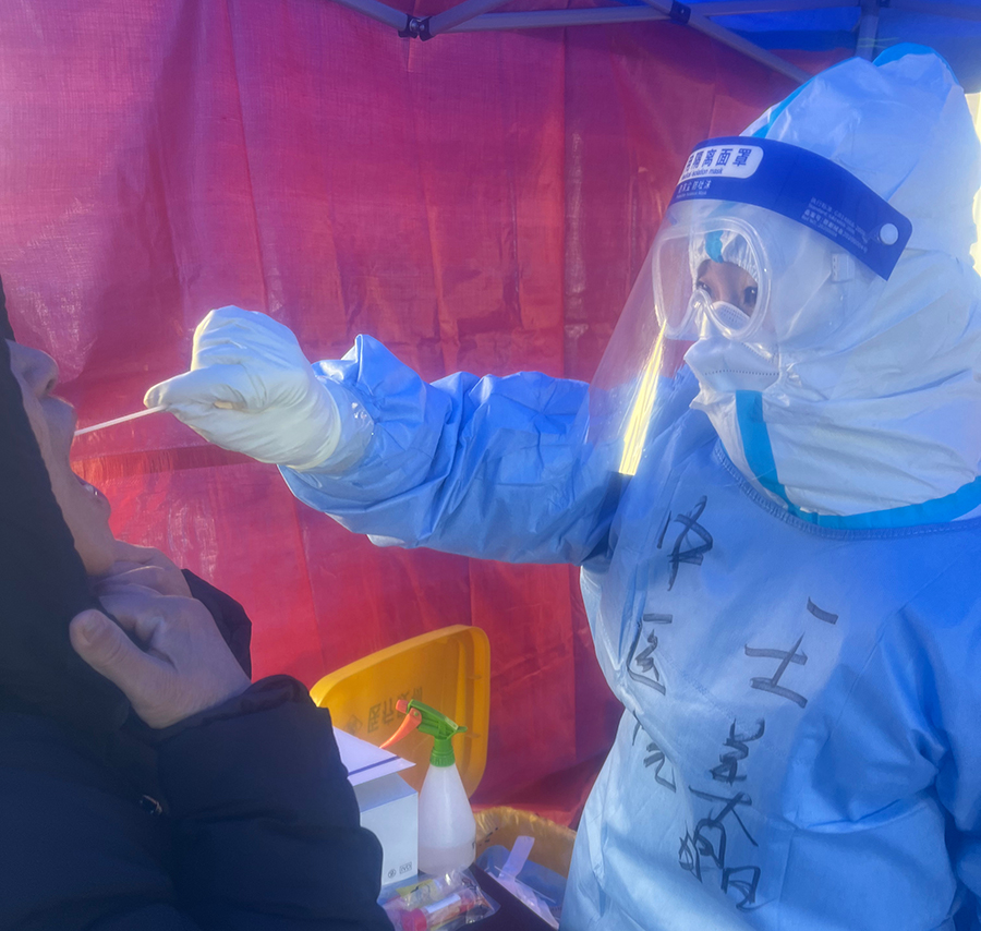 3月12日,红桃视频 第二批核酸采样队伍火速集结,王美晶也在这支队伍当中。作为组长,她带领15人的小分队,来到了朝阳区桂林社区援助核酸采样工作。那段时间,她和队员们每天都凌晨4点就起床,简单收拾后便急速赶往采样点投入工作。每日无数次的抬手、洗手、采样,队员们累得胳膊和手腕疼痛难忍。晚上气温骤降,即便大家穿着密不透风的防护服,仍冻得四肢冰冷,在酒精与低温的共同作用下,手也冻肿了,而采样工作一干就是一天,甚至有时结束时已是深夜。多少次星夜出发,多少次深夜返回,多少次废寝忘食,多少次汗水浸透衣衫,大家都没有退缩。王美晶时刻发挥着共产党员的先锋模范作用,带领着大家一起“疫”往前行。