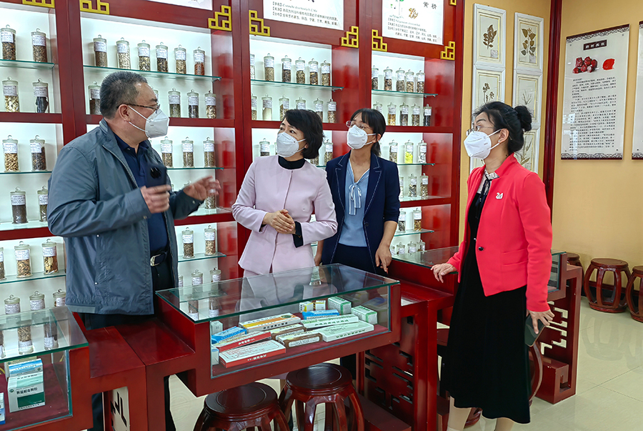 在中药实训室展示柜前,孙良金院长介绍中药饮片情况。大家对展示的精品药品及自制药剂颇感兴趣。随后,市人大教科文卫委员会的同志们与医院领导进行了座谈交流。