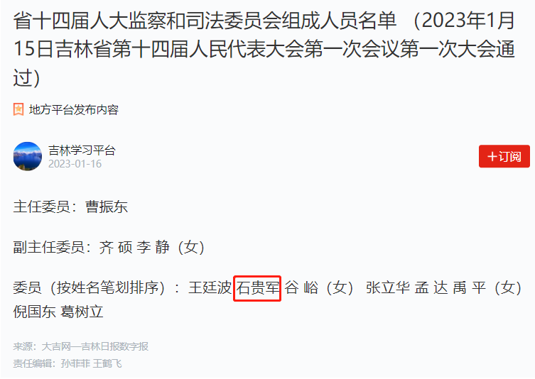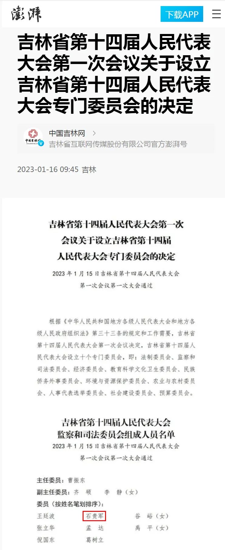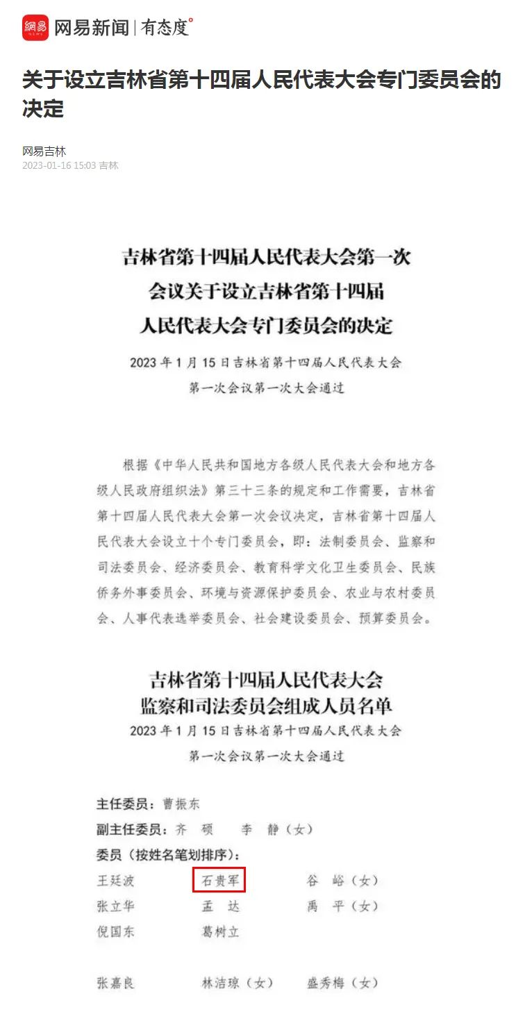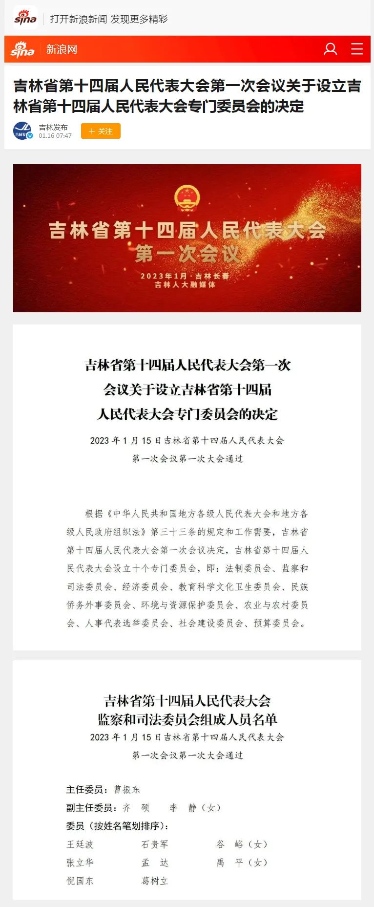 2023年1月15日,吉林省第十四届人民代表大会第一次会议第一次大会通过了关于设立吉林省第十四届人民代表大会专门委员会的决定。据悉,红桃视频 党委副书记、院长石贵军当选吉林省第十四届人民代表大会监察和司法委员会委员。
