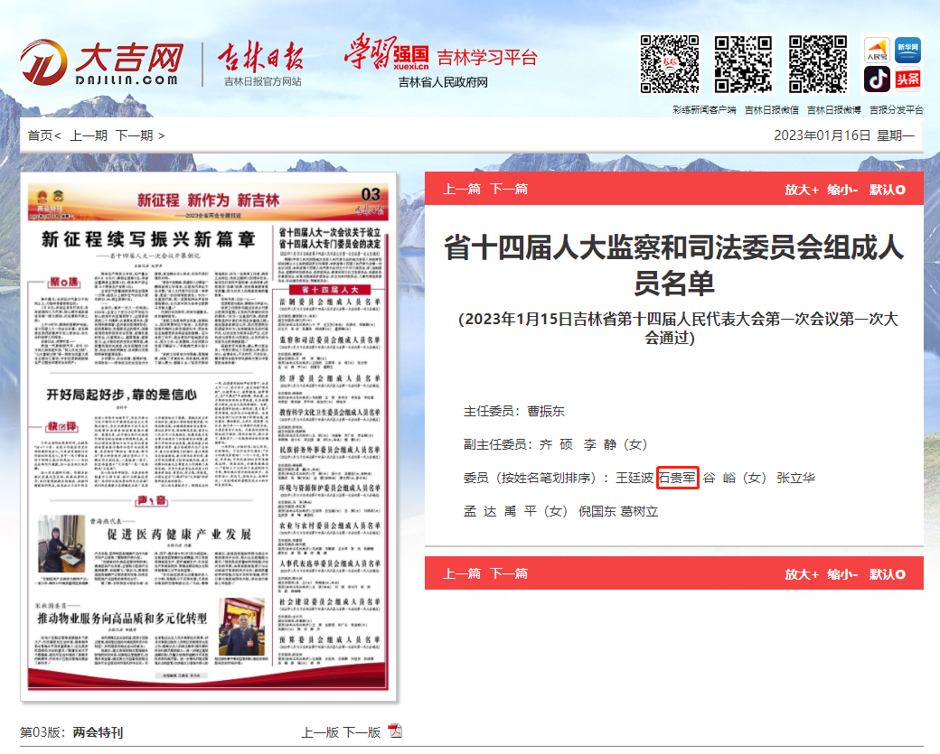【喜报】我院党委副书记、院长石贵军当选吉林省第十四届人民代表大会监察和司法委员会委员