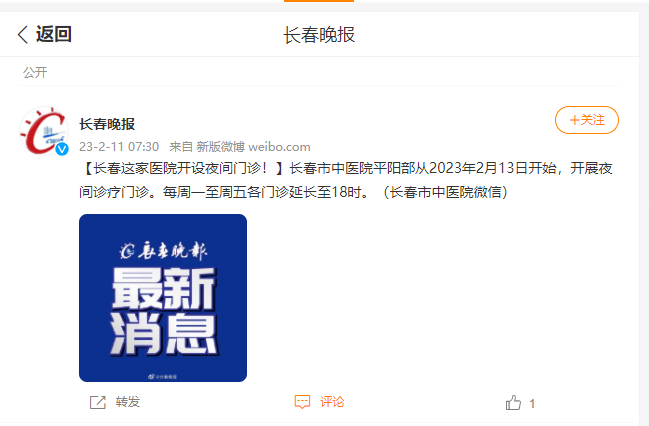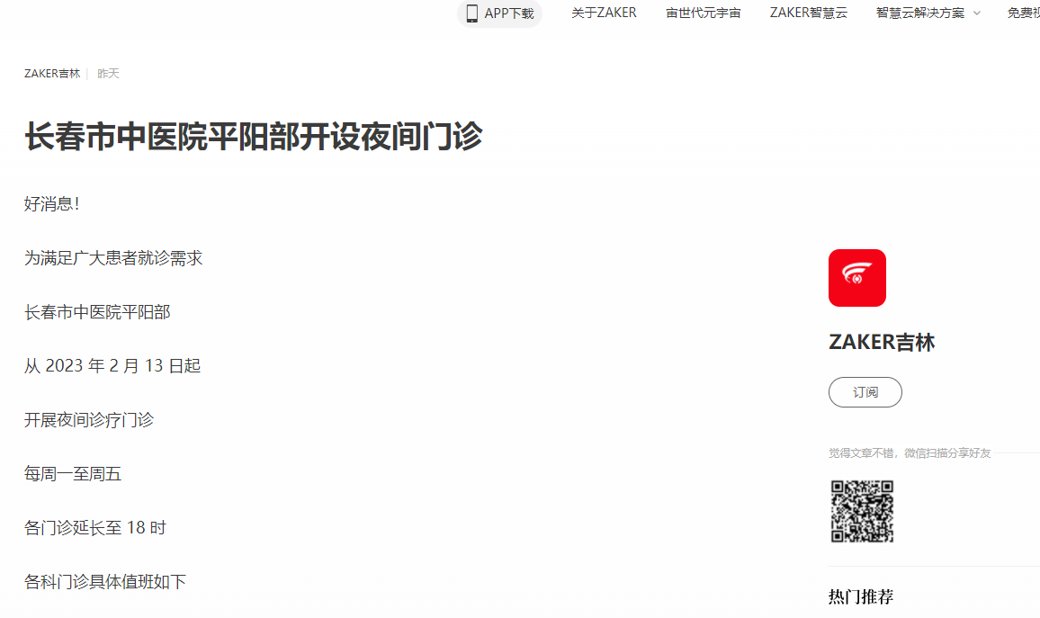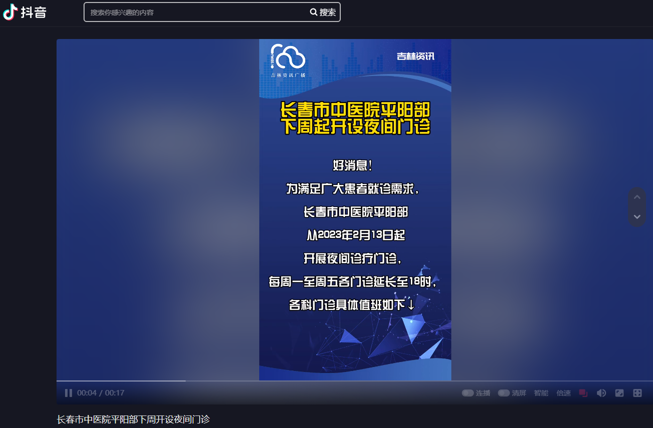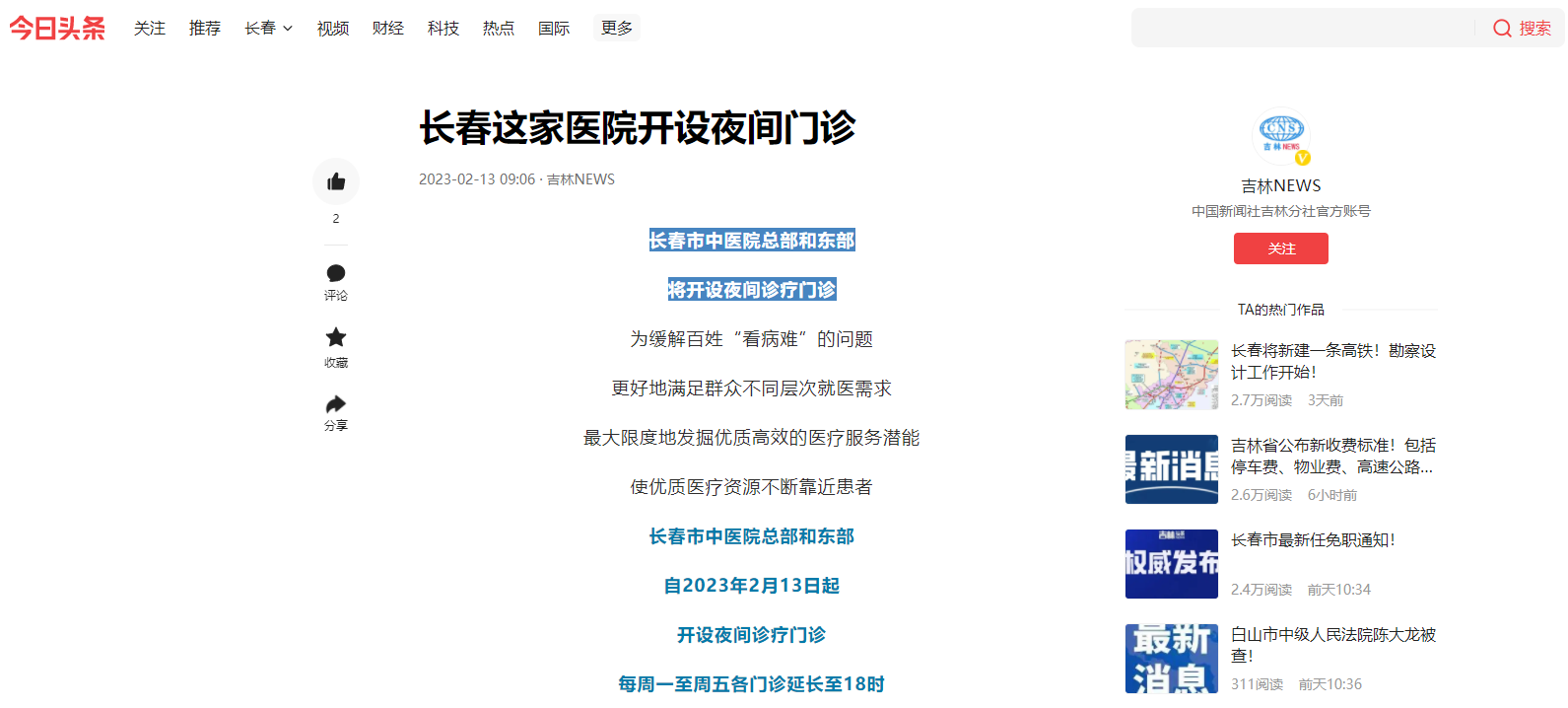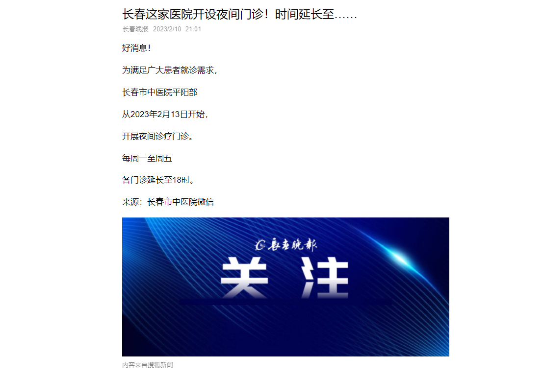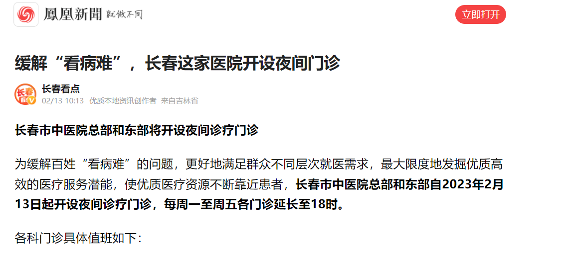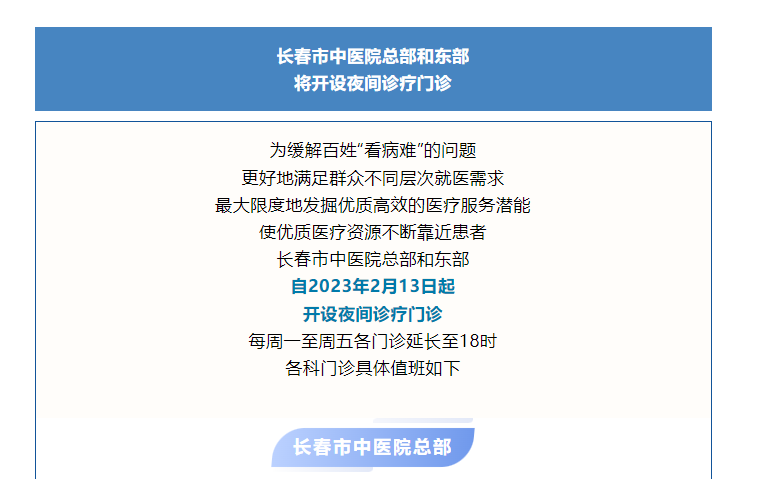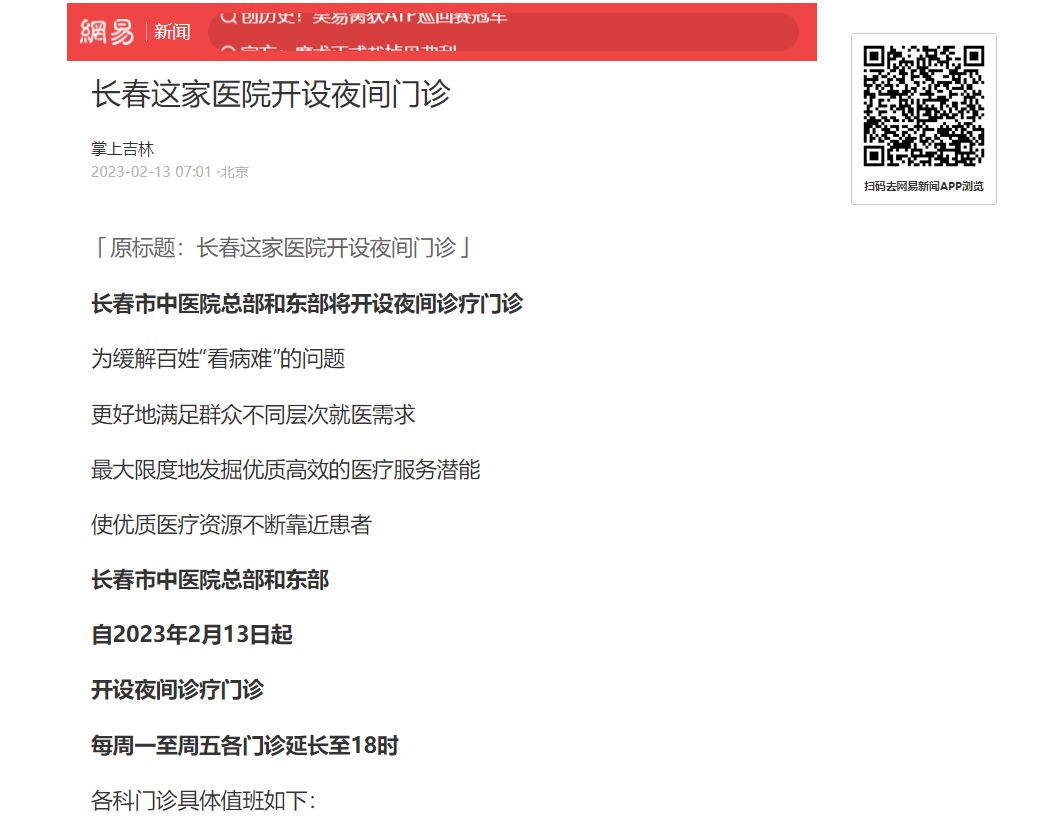 为缓解百姓“看病难”的问题,更好地满足群众不同层次就医需求,最大限度地发掘优质高效的医疗服务潜能,使优质医疗资源不断靠近患者,红桃视频 再出惠民实招,决定自2023年2月13日起,开设夜间诊疗门诊,每周一至周五各门诊延长至18时。消息发布后,被吉和网、今日头条、腾讯新闻等多家媒体报道转载。