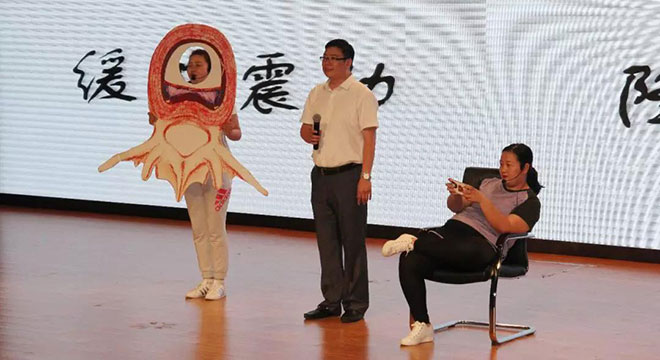 为了让大家清楚地认识腰间盘,护士王孟琪身穿模具,装扮成腰间盘的模样说:“我就是腰间盘,我虽然小,我干的活可多了。我们在脊柱里默默支撑着主人的身体,不张扬、不惹事。其实我的家庭成员很庞大,一共有23个兄弟,分布在人体的颈椎、胸椎和腰椎。”