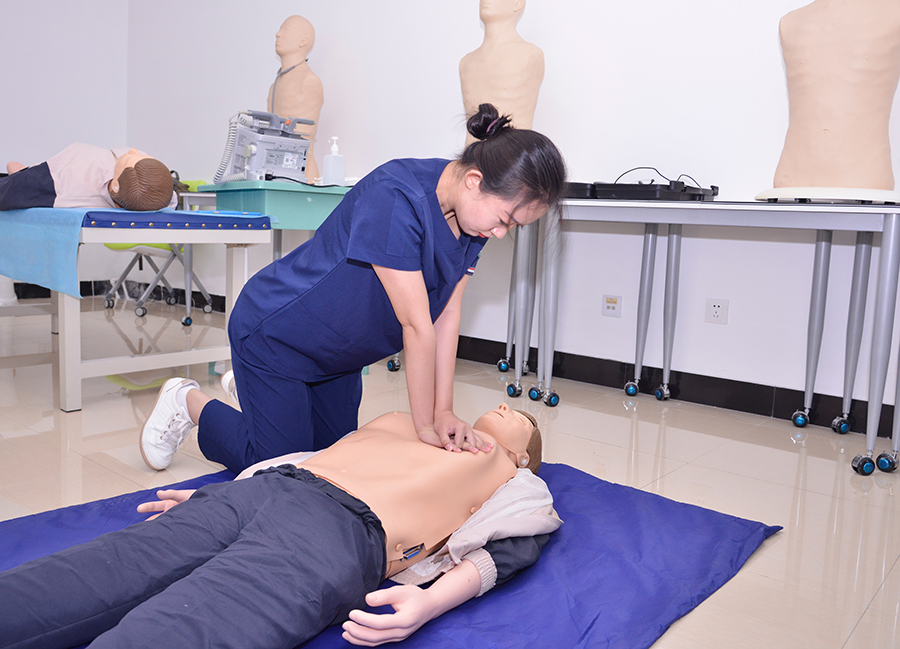 “8号床,8号床,您怎么了?病人意识丧失,呼吸心跳停止,诊断心脏骤停,需要紧急心肺复苏”“喂喂,您怎么了?周围环境安全,患者身体无金属、无意识,紧急抢救,检查除颤仪,设备完好,开始抢救。”选手洪亮的声音,快捷有序的实操,模拟出真实的抢救现场。在整个急救过程中,选手们将娴熟的技能发挥得淋漓尽致,尽显作为医生所需的心理素质和责任感。