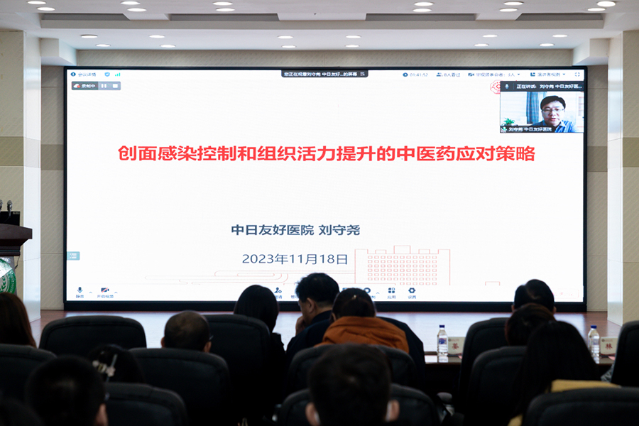 中日友好医院中医外科刘守尧以《创面感染控制和组织活力提升的中医药应对策略》为题,围绕创面感染如何科学预防、中医药特色方药在促进创面愈合的独到作用等内容展开重点讲解,并在线上回答了现场伤口专科医护人员有关糖尿病足在愈合方面清创、减压、PRT技术等相关问题。