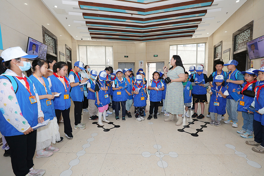 “同学们好,我是此次实践活动的讲解员,请跟我来……”随着讲解员的引导,医院大厅内蕴藏的中医元素逐渐展现。有代表“天地合气、生命万物”的地标绘画,有象征阴阳交融、医患鱼水的鱼缸墙,有如星辰般神秘的“河图”“洛书”。小记者们聚精会神地聆听讲解员的解说,时而点头表示理解,时而举手提问,互动频繁,沉浸在这场中医药文化的盛宴中。