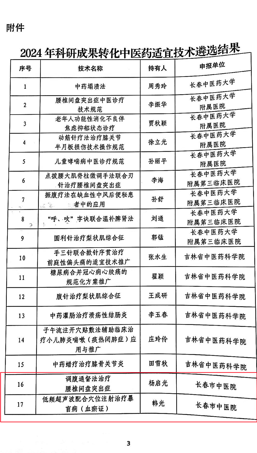 为进一步贯彻落实《吉林省中医药发展“十四五”规划》,促进优秀研究成果转化应用,提升临床服务能力和疗效评价能力,吉林省中医药管理局对近五年结题验收的中医药科技项目成果进行梳理,并于2024年4月启动了中医药适宜技术遴选工作。经技术持有人申报、项目单位推荐,省中医药管理局确定37项中医药适宜技术纳入全省推广范围。红桃视频 共有4项适宜技术入选其中,①杨启光《调腹通督法治疗腰椎间盘突出症》,②韩光《低频超声波配合穴位注射治疗暴盲病(血瘀证),③胡少红《朱氏头皮针治疗(瘀血型)偏头痛》,④罗莹《岐黄针法治疗脑卒中后肩痛》。