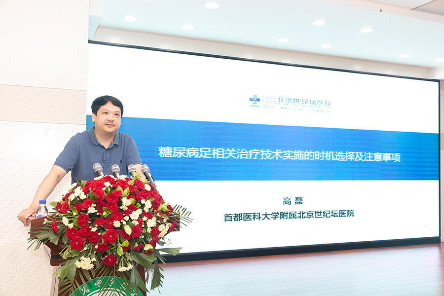 首都医科大学附属北京世纪坛医院矫形外科副主任高磊,以《糖尿病足溃疡治疗技术时机选择及注意事项》为主题,在会上进行了主旨演讲。
