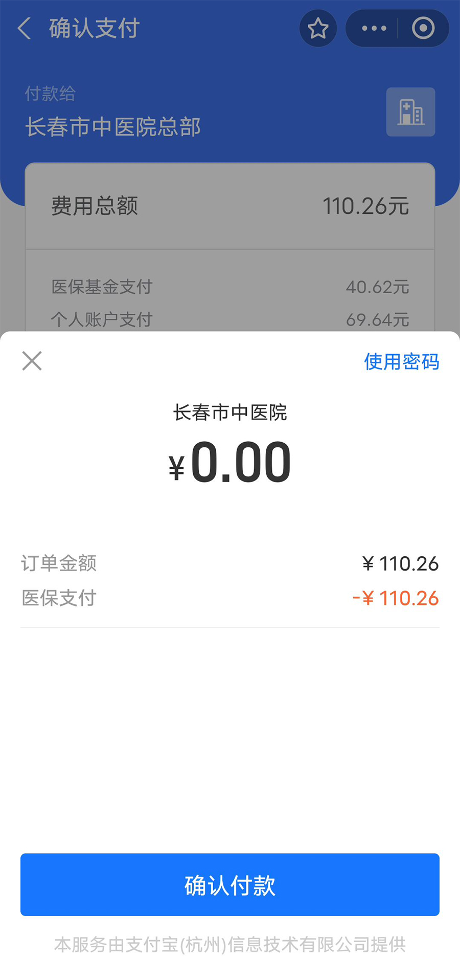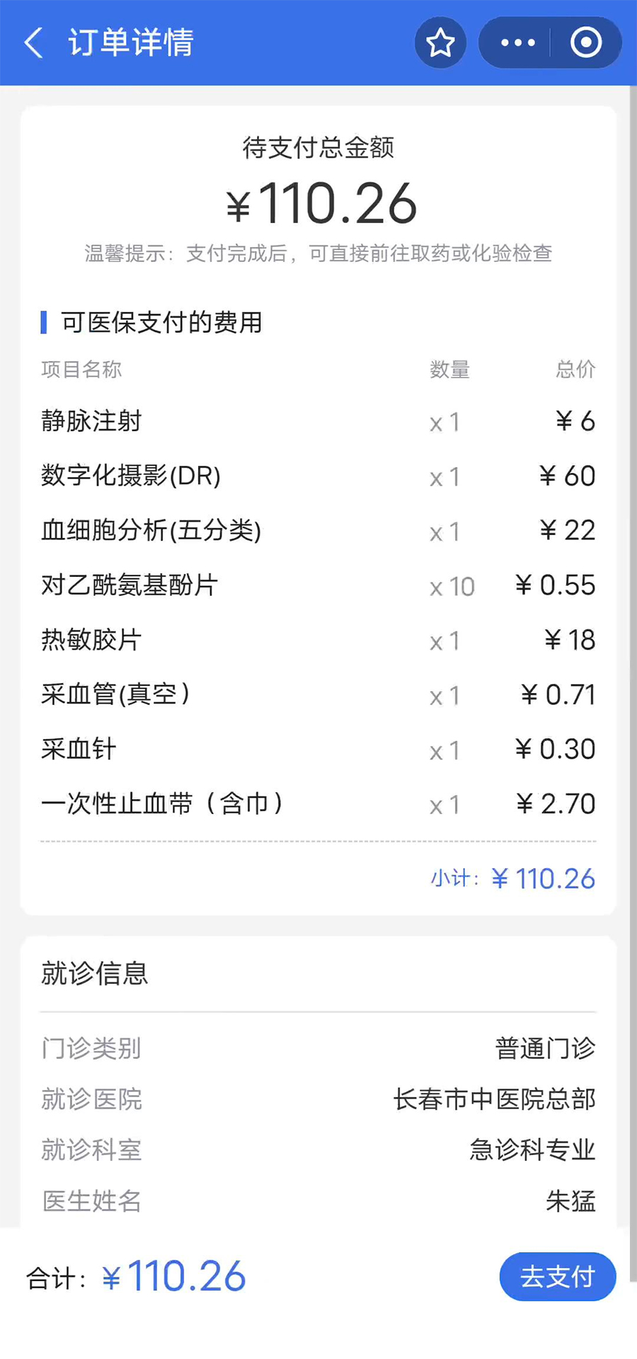 查看订单详情点击去支付-获取医保/自费扣费情况-点击去支付